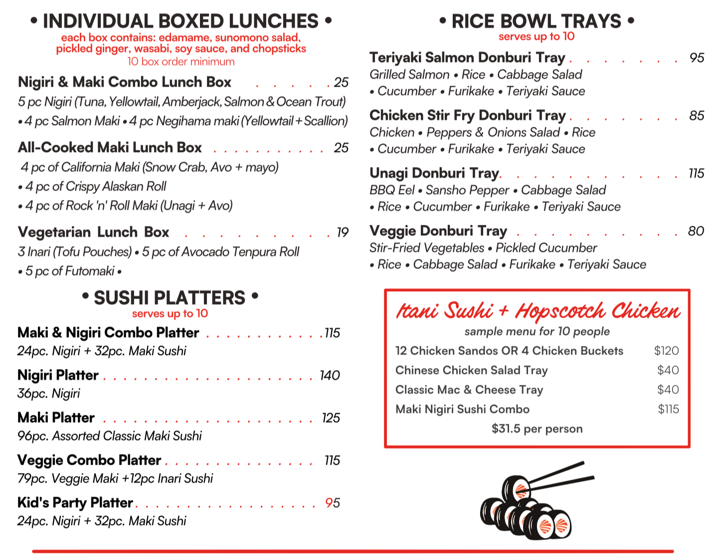 We have platters, trays, and boxed lunches available from both Itani Sushi and Hopscotch Chicken. We typically require 24 hours notice for orders and a minimum order of $150. For catering deliveries, cancellations must be made at least 24 hours in advance.