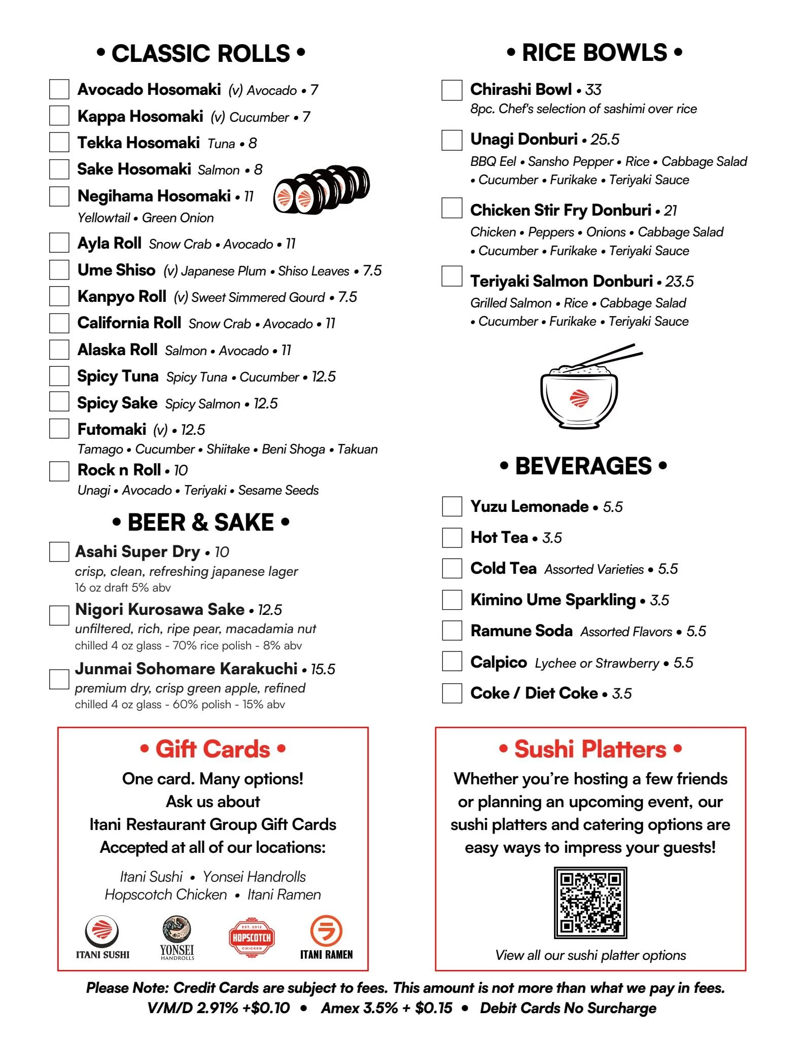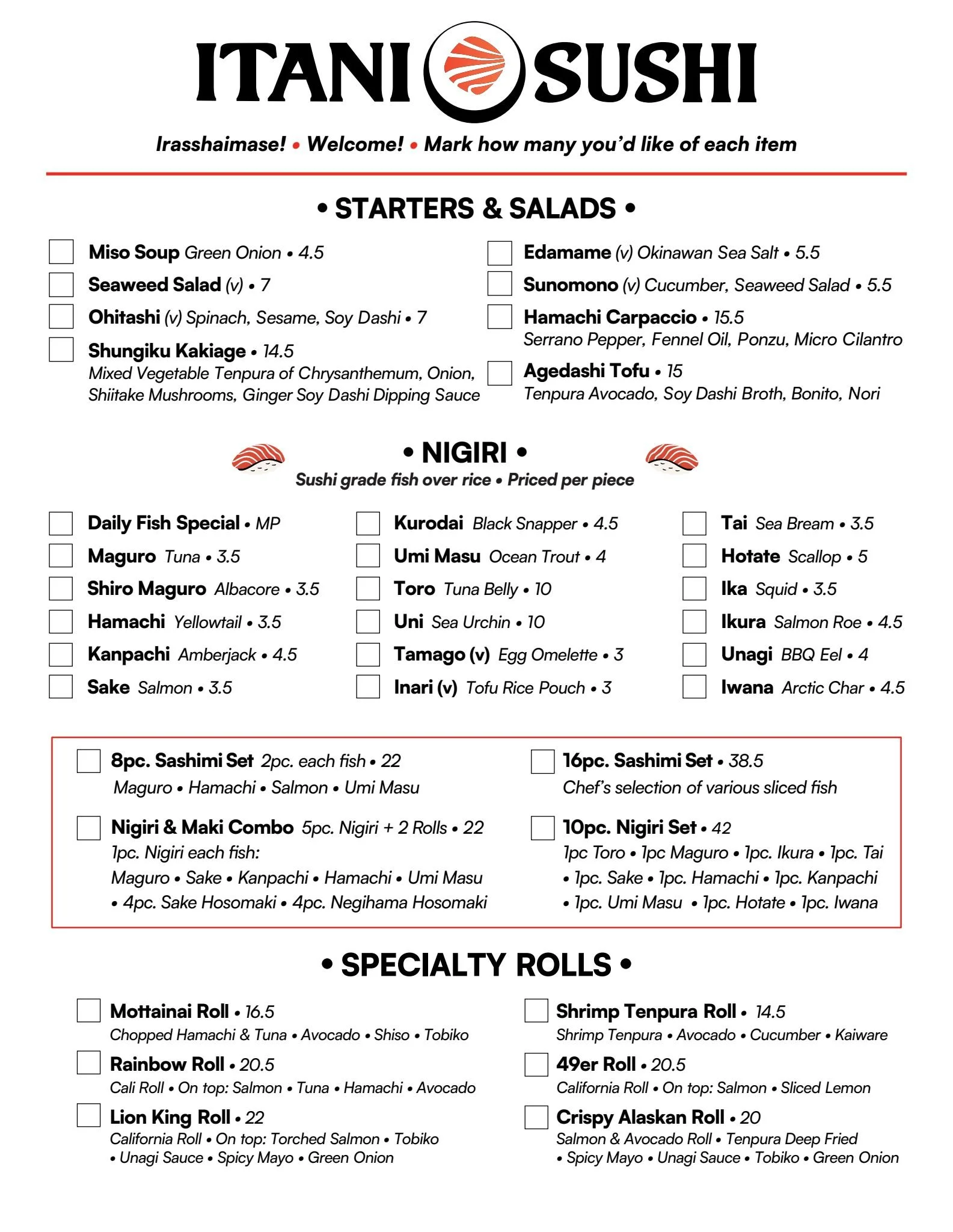 Irasshaimase! Itani Sushi is now open for dine-in! Grab a seat at our sushi bar for fresh nigiri, sashimi, and rolls made-to-order. In a hurry? Choose from our cold case to enjoy on the patio, in the back garden, or take it to go.